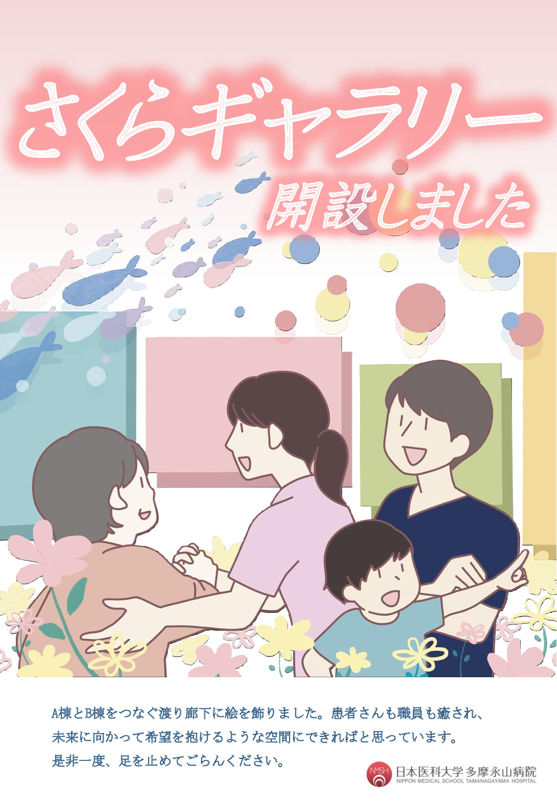 2020年、アメニティー棟を設置するために、毎年春に見事な桜で私たちを感動させてくれた桜の木をやむなく伐採しました。それから3年、渡り廊下からわずかに見える桜からあの素晴らしかった桜を思い出し、忘れないために「さくらギャラリー」と名付けました。そして、患者さんも職員も癒され、未来に向かって希望を抱けるような空間にできればと絵画などでかざり付けをしていますので、是非一度、足をとめてご覧ください。